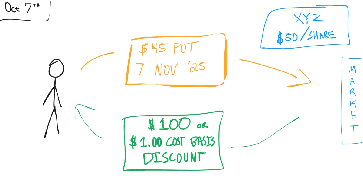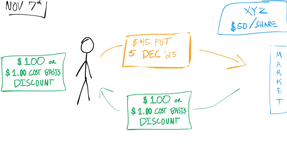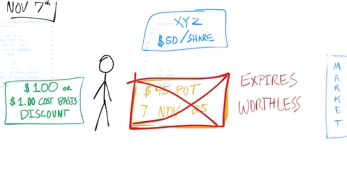 Let’s say XYZ is trading at $50 per share. We decide to sell the $45 strike put expiring November 7th and collect a $1 premium ($100 total). We only do this if we believe XYZ would be a good purchase at $45.