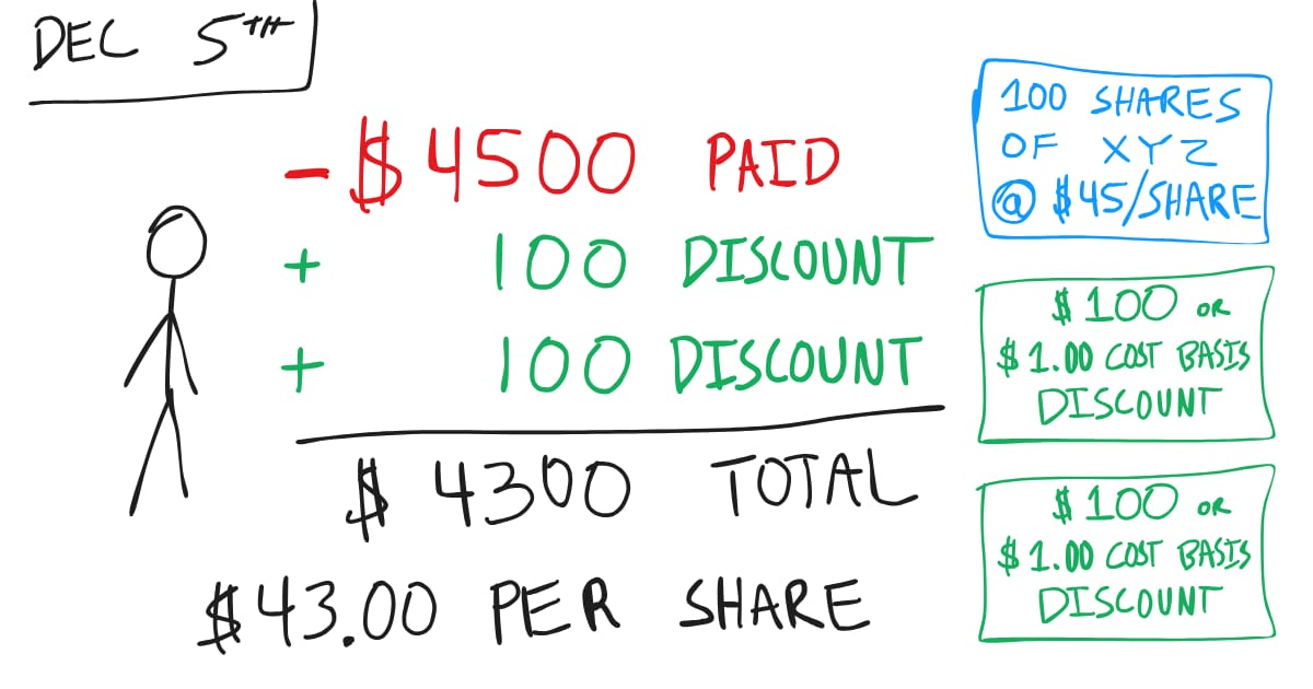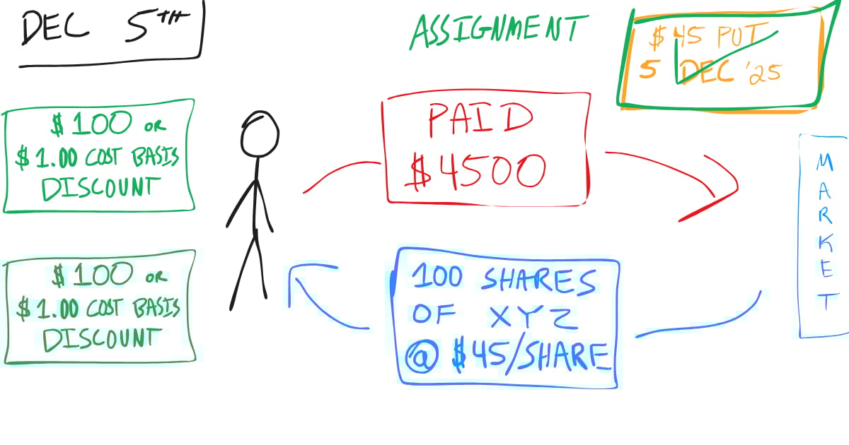 This time, December 5th comes, and XYZ has dropped to $44. We’re assigned, so we purchase 100 shares at $45.
