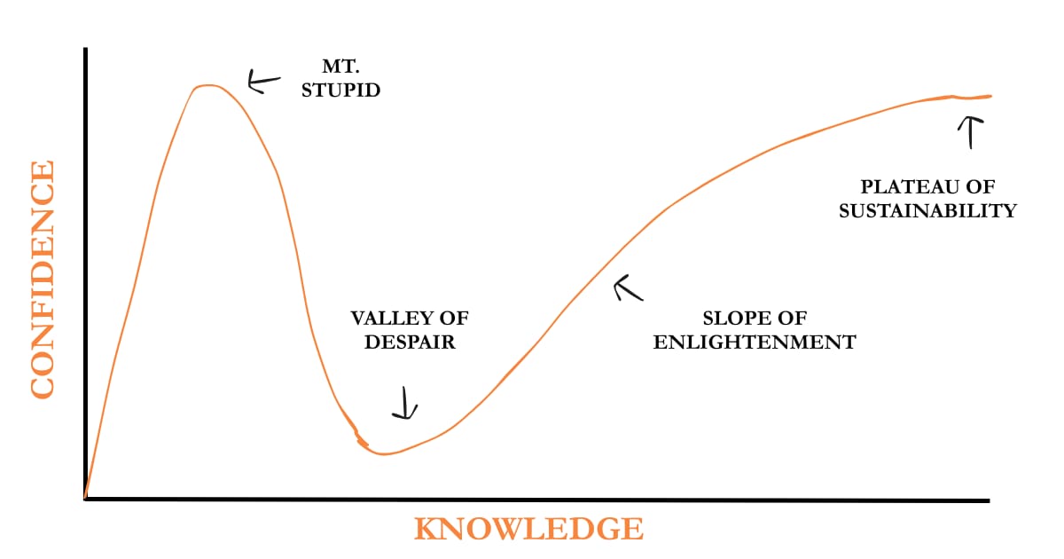Basically, early on, with limited experience, everything feels simple and obvious. Confidence is sky high. Then reality sets in, confidence drops, and many quit right when the real learning begins.